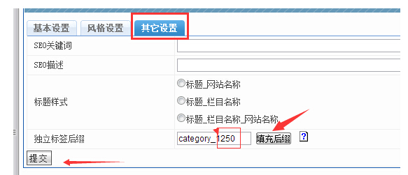 點擊其他設(shè)置,點擊填充后綴,會產(chǎn)生一個和欄目ID相同的數(shù)字(獨一無二的);如果想改為和其他相同后綴,就改下那個比如440的數(shù)字,然后點擊提交即可。