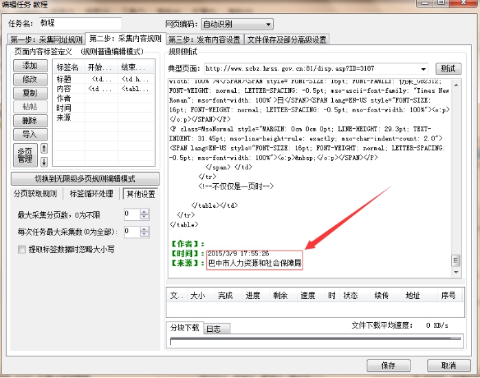 提醒注意:以上圖中[標(biāo)簽:時(shí)間][標(biāo)簽:來(lái)源][標(biāo)簽:作者]并不是隨意寫的,是與圖2中采集內(nèi)容規(guī)則中的標(biāo)簽名“時(shí)間,來(lái)源,作者”是對(duì)應(yīng)的。如下圖所示。