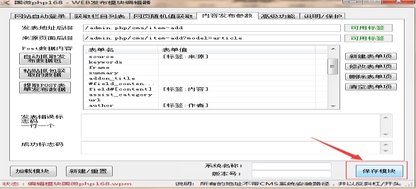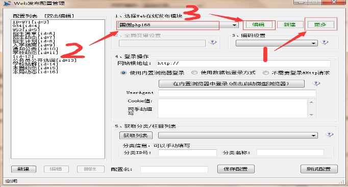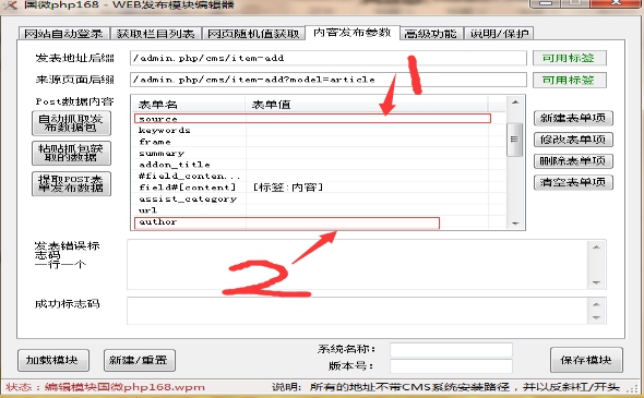 2、第一步從國(guó)微采集壓縮包中找到國(guó)微php168發(fā)布模塊導(dǎo)入,第二步選擇下圖中的紅框中的發(fā)布模塊“國(guó)微PHP168“模塊,第三步點(diǎn)擊“編輯”按鈕。