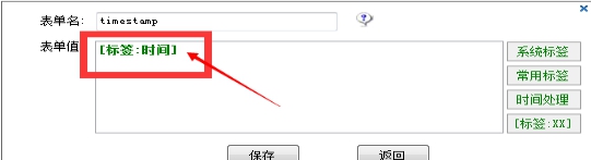 4、在彈出的框中,表單值中寫入[標(biāo)簽:時(shí)間],并保存,list_order也類似,如下圖所示。