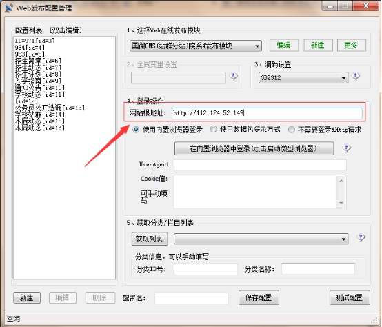 3-7 我們把上面抓包工具的所獲取的user-agent和cookie值粘貼到對應的區域,然后點擊獲取列表,選擇你所要發布的欄目(注意:選擇欄目時不要選擇一級欄目),具體步驟如下: