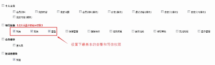 然后點擊上面的【點擊詳細設置前臺權限】 ,進入此頁面。勾選需求的權限。左邊的列表、寫信、查看權限是必須的,所以必須給予。右邊的管理權限,根據(jù)此用戶需要管理的內容來定。