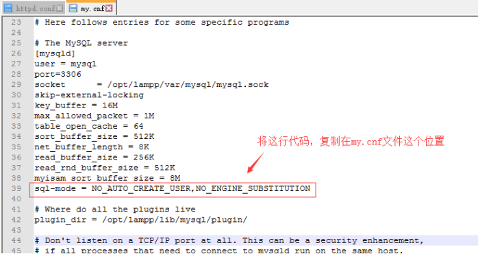 2)在目標(biāo)項(xiàng)目中的my.conf數(shù)據(jù)庫配置文件中,將剛剛上面那行代碼復(fù)制到下面此處(當(dāng)然可以其他地方),然后保存,重啟環(huán)境即可。