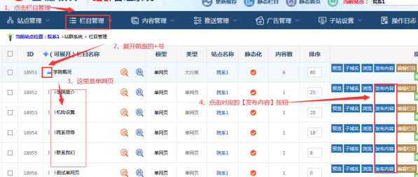 進(jìn)入子站后臺(tái),點(diǎn)擊【欄目管理】-----點(diǎn)擊展開單網(wǎng)頁一級(jí)目錄前面的【+】號(hào)-----看到對(duì)應(yīng)的單網(wǎng)頁內(nèi)容后