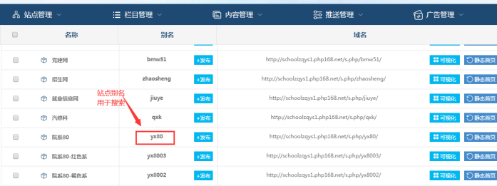 1)、在站群后臺(tái)-----找到該子站的別名【yx80】