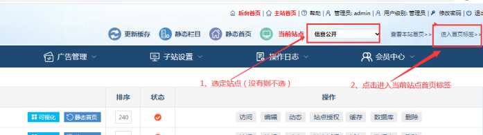 方式A:進入子站后臺----選擇當前站點(只有一個站點則不選)---點擊【進入首頁標簽】: