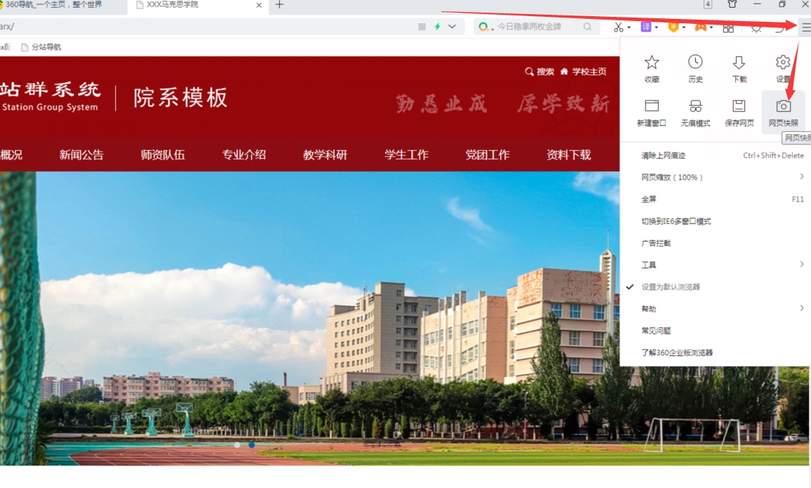 B:打開后,點擊360瀏覽器右邊的操作按鈕,然后點擊【網(wǎng)頁快照】