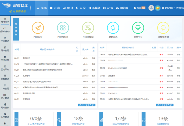 主站后臺也可以進行完整的內容發布、內容管理、欄目管理、菜單管理、標簽可視化管理、logo和橫幅管理等所有操作。