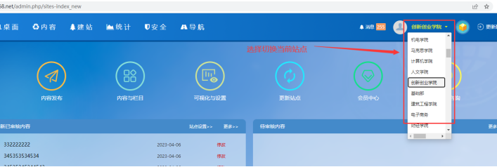 一般情況進入后,就是自己當前管理的站點,如果自己有權(quán)限管理多個子站,這里是可以切換站點的