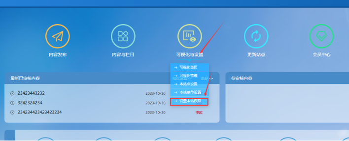 方法1:鼠標放在【可視化與設(shè)置】按鈕上---選擇【本站權(quán)限設(shè)置】