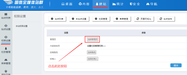 在子站后臺,鼠標點擊【建站】-----點擊【權(quán)限設(shè)置】