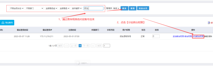 B、在彈出框中------進行相關(guān)搜索后,看到相關(guān)賬號-----點擊該賬號的【分站前臺權(quán)限】