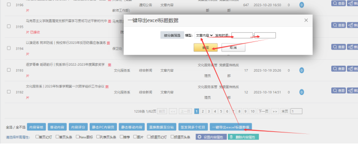 D、點擊【一鍵導出excel標題數據】------選擇【文章內容】-----選定日期段---點擊確認: