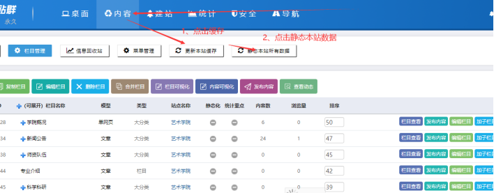 C、進入后臺后----鼠標點擊【內(nèi)容】按鈕------點擊【更新本站緩存】----點擊【靜態(tài)本站所有數(shù)據(jù)】