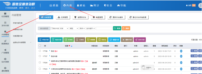 進入各個子站點后臺----點擊【內容】按鈕-----點擊【內容管理】: