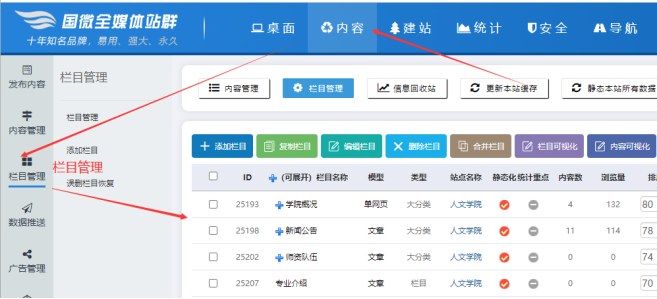 C、點擊【內容】---【欄目管理】,可以進入欄目管理界面