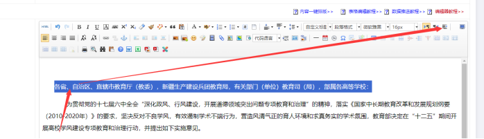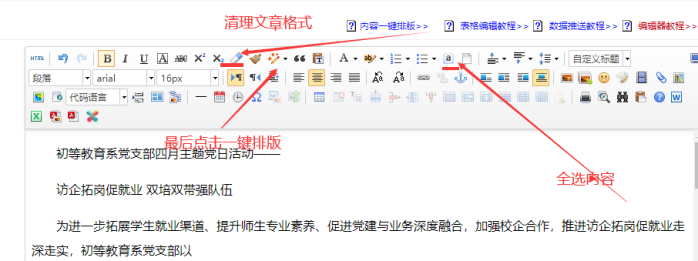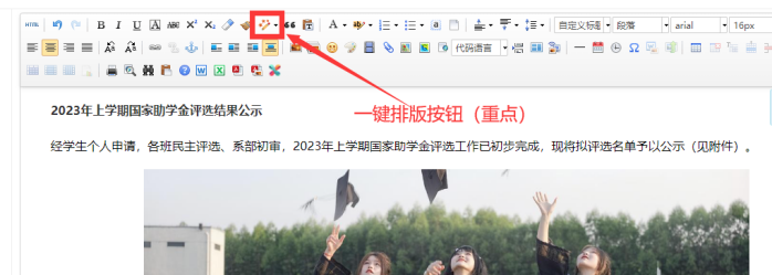 為了讓網(wǎng)站內(nèi)容稿件格式正確,直接點(diǎn)擊【一鍵排版】按鈕即可,一鍵排版的初始化格式由宣傳部提供。