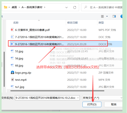 B、在彈出框中,選擇所需要的文檔(docx格式的)-----點(diǎn)擊【打開】