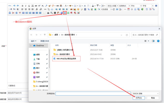 A、點(diǎn)擊編輯器word圖標(biāo)-----選擇對(duì)應(yīng)文件(現(xiàn)在只支持docx文件)