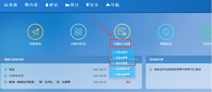 方法:在子網(wǎng)站后臺(tái)-----鼠標(biāo)放在【可視化和設(shè)置】按鈕上--------點(diǎn)擊【本站點(diǎn)設(shè)置】: