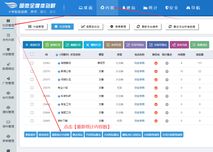 方法:在子網(wǎng)站后臺(tái)-----點(diǎn)擊【內(nèi)容】按鈕-------點(diǎn)擊【欄目管理】-----點(diǎn)擊【重新統(tǒng)計(jì)內(nèi)容數(shù)】: