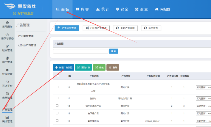1、進入后臺---點擊面板---廣告管理----點擊新增廣告類型
