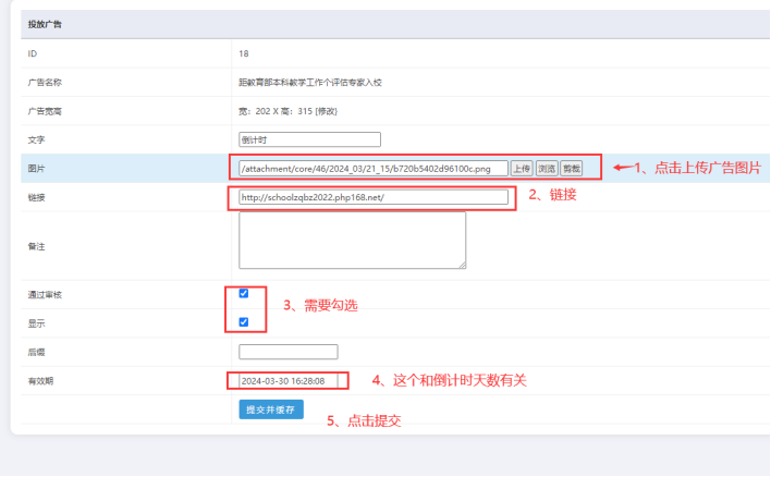 上傳所需的漂浮背景圖圖片、加上圖片鏈接、通過審核和顯示都要打鉤,特別是那個有效期,就是倒計時為止的時間,按這個計算天數,最后點擊提交