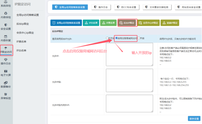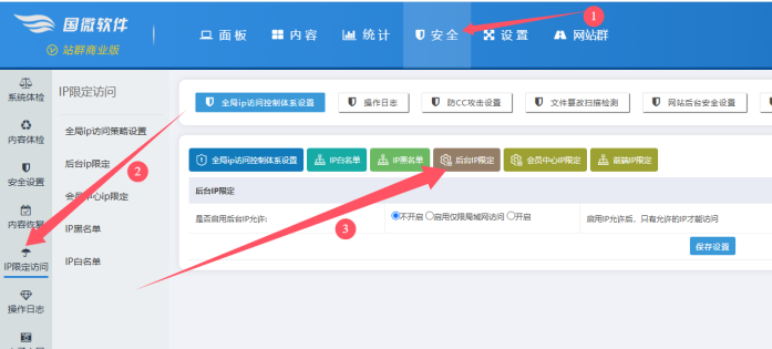 A、登錄網(wǎng)站后臺-------點(diǎn)擊【安全】-------點(diǎn)擊【ip限制訪問】-----點(diǎn)擊【后臺ip限定】