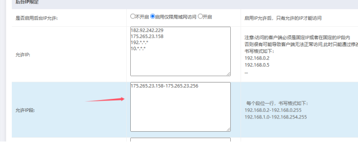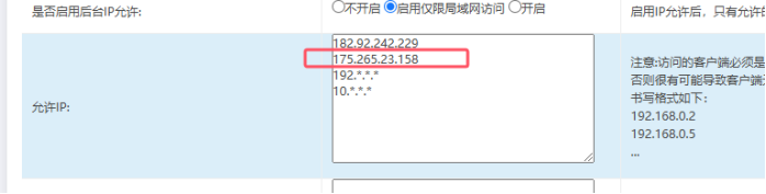 場景:如果我們想僅部分ip可以登陸后,其他人不允許,這個(gè)時(shí)候就需要設(shè)置限制ip登陸后臺的功能。如果設(shè)置后,又需要增加一些ip納入可以訪問后臺的情況,就增加即可。
