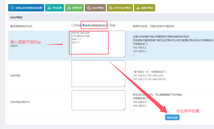 B、 點(diǎn)擊【啟用ip限定】------下面框框中輸入對應(yīng)的需要開放的ip--------然后點(diǎn)擊【保存設(shè)置】
