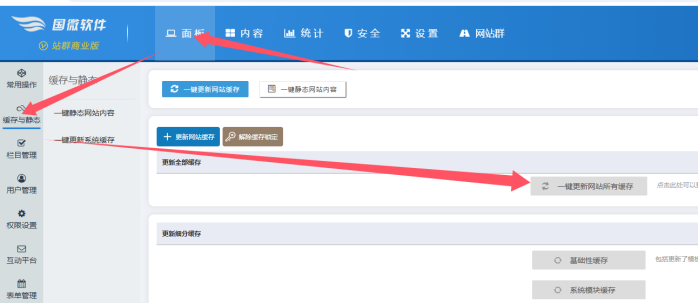 點(diǎn)擊【面板】-----點(diǎn)擊【緩存與靜態(tài)】------點(diǎn)擊【一鍵更新網(wǎng)站所有緩存】----平常設(shè)置ip限定功能,一般需要更新三次緩存左右才會生效