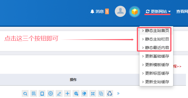 進入【主站后臺】后-------鼠標放在右上角【更新網站】按鈕上-----分別點擊【靜態主站首頁】、【靜態主站欄目】、【靜態最近內容】-----最后快速連續刷新幾次頁面即可 :