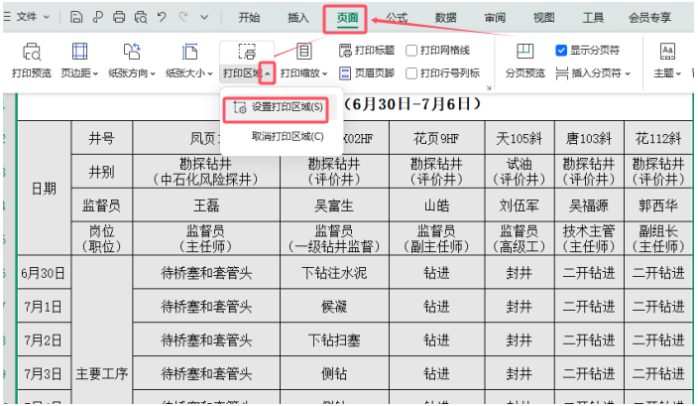 2、點(diǎn)擊【頁面】按鈕------點(diǎn)擊【打印區(qū)域】下拉箭頭-------點(diǎn)擊【設(shè)置打印區(qū)域】