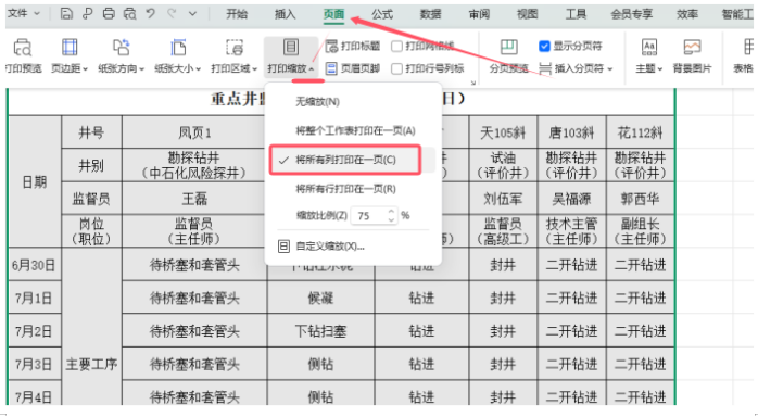 3、然后點(diǎn)擊【頁面】按鈕------點(diǎn)擊【打印縮放】下拉箭頭-------點(diǎn)擊選擇【將所有列打印在一頁】