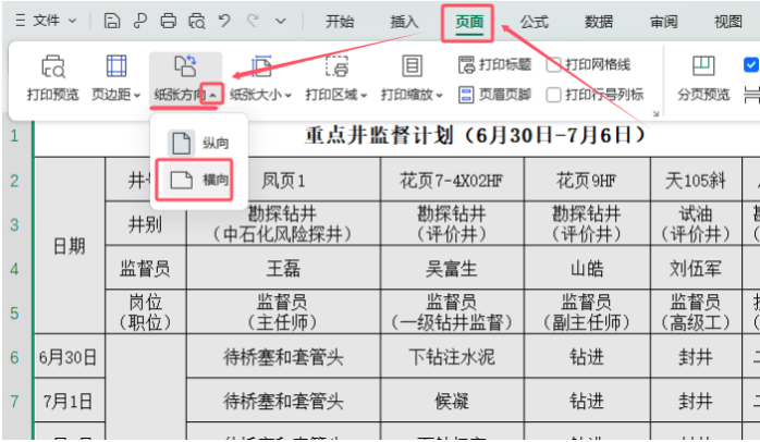4、如果你這個表格比較寬的情況,再點(diǎn)擊【頁面】按鈕------點(diǎn)擊【紙張方向】下拉箭頭-------點(diǎn)擊選擇【橫向】