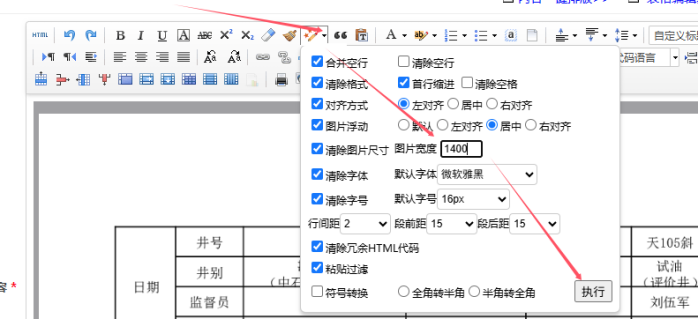 2、如果這個表格比較寬,需要更大更清晰的圖片-------在一鍵排版按鈕位置-----點(diǎn)擊【下拉黑色箭頭】------圖片寬度設(shè)置為【1400】或其他合適數(shù)字-------點(diǎn)擊【執(zhí)行】------再點(diǎn)擊【提交發(fā)布】即可