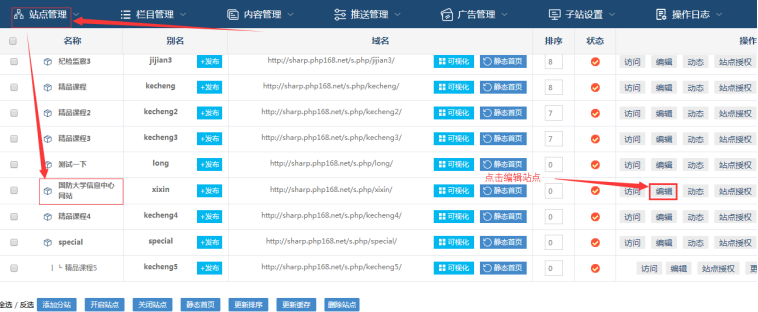 A、如果想編輯該子站信息,比如網站模板,點擊此處“編輯”按鈕。