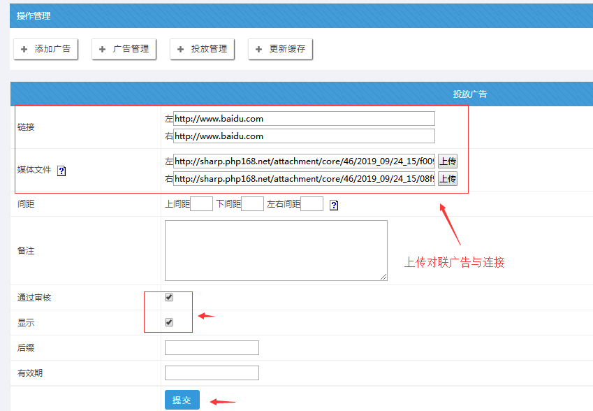 填寫好左右圖片的鏈接、上傳左右圖片;另外可以設置對聯廣告上下間距(比如上間距10cm,可以進入需要調試)