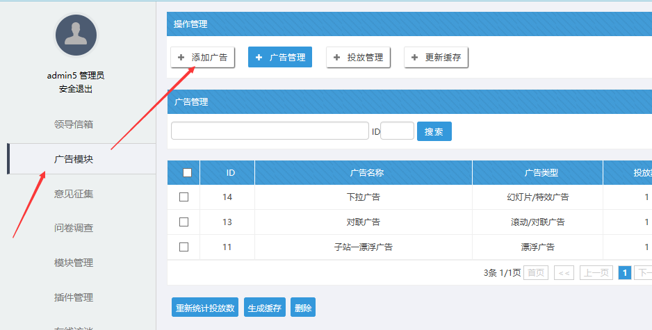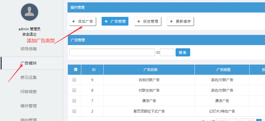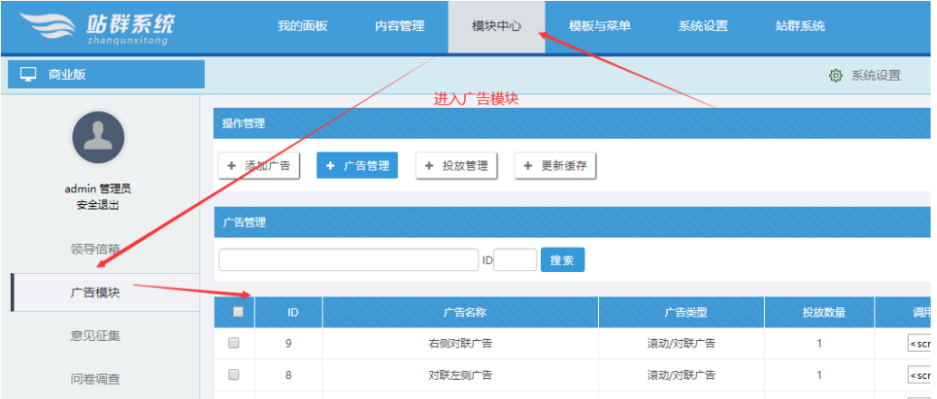 一、進入主站的廣告模塊(超級管理員)