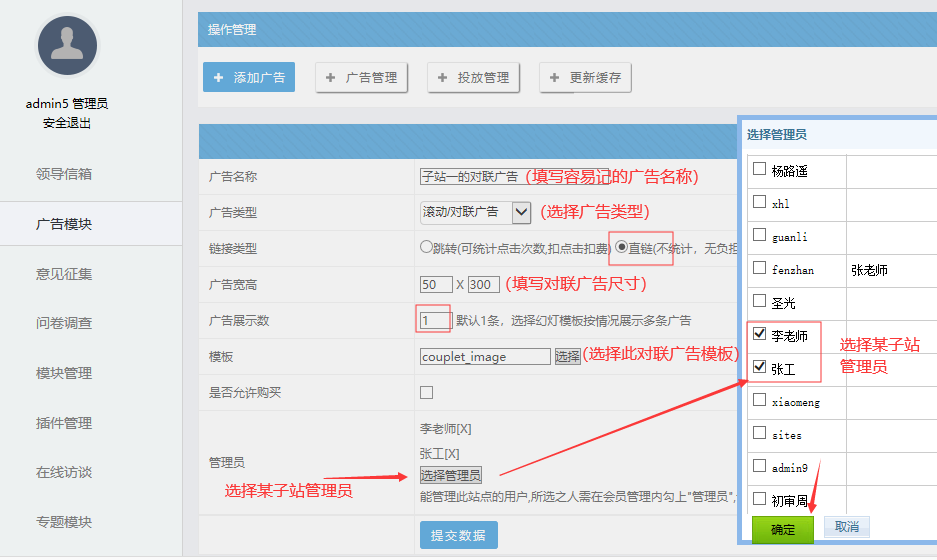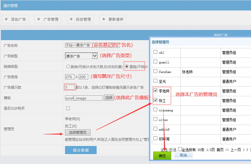 注意事項: 廣告名稱一定要命名好,要不然分不清是哪個子站的; 其他的根據下圖選擇即可;管理員的的選擇必須選擇某子站的管理員,這樣后續在站群系統中就可以看到此廣告了。