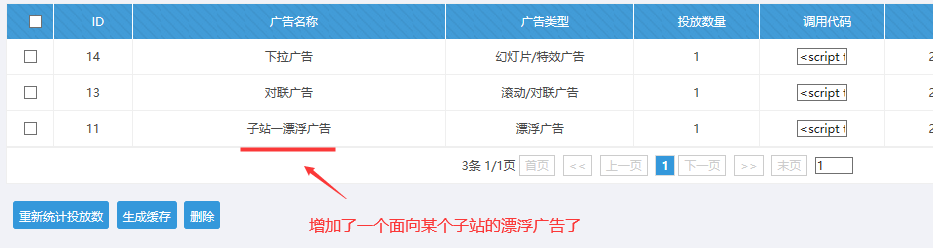 備注:上面的步驟做好后,該子站管理員,在站群后臺-----點擊廣告管理------可以看到對應的廣告類型------然后投放廣告進行預覽--------然后將所需調用的廣告類型js,放到子站首頁底部標簽(一次即可)--------最后更新緩存,靜態首頁刷新即可看到效果。