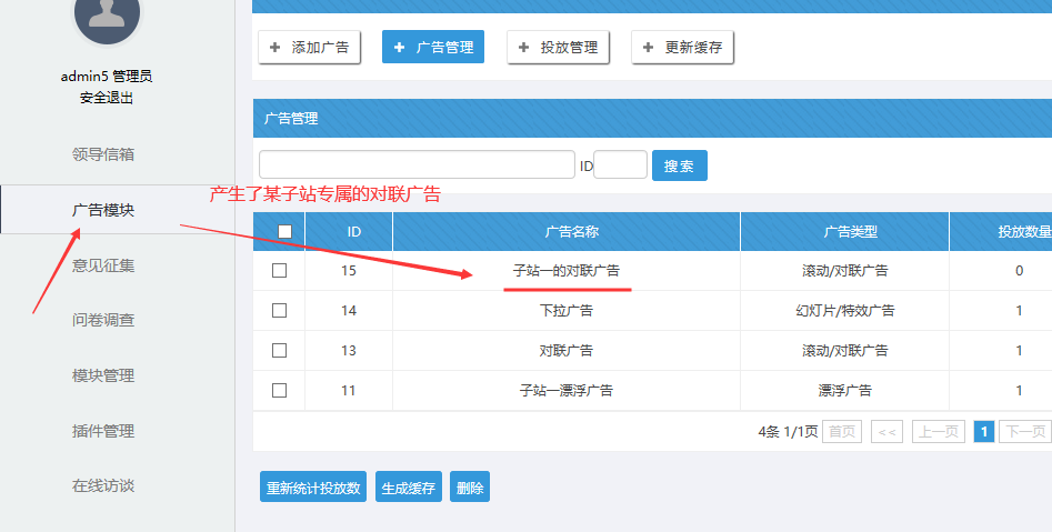 子站的廣告原理如下:首先是子站設置某人為該站管理員;然后主站后臺廣告模塊中,將某類廣告(比如某個漂浮,可以建立很多個漂浮類型廣告給不同的子站)授權給該子站管理員;那么該用戶管理員就可在站群廣告模塊中,看到自己的廣告。