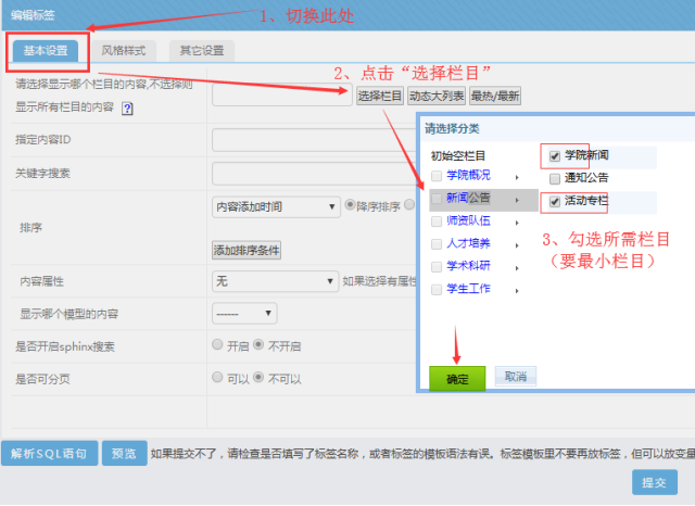 點(diǎn)擊“基本設(shè)置”-----點(diǎn)擊“選擇欄目”---“勾選所需的欄目”(可以勾選多個(gè),要勾選最小欄目)--點(diǎn)擊“確定”: