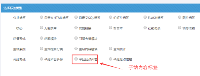 特別說明: 此標(biāo)簽類型,在標(biāo)簽列表中,屬于“子站站點(diǎn)內(nèi)容”標(biāo)簽,如果是一個(gè)新標(biāo)簽,之前沒有進(jìn)行過任何設(shè)置,需要內(nèi)容效果,那么就雙擊標(biāo)簽后,選擇此處即可!
