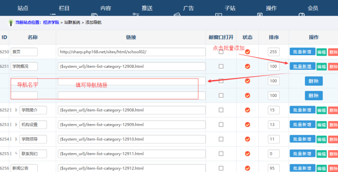 如果需要新增二級菜單,就點擊某個一級菜單的“批量新增”按鈕;可以同時增加很多個菜單,每行加上菜單名字、菜單鏈接、菜單排序數字。