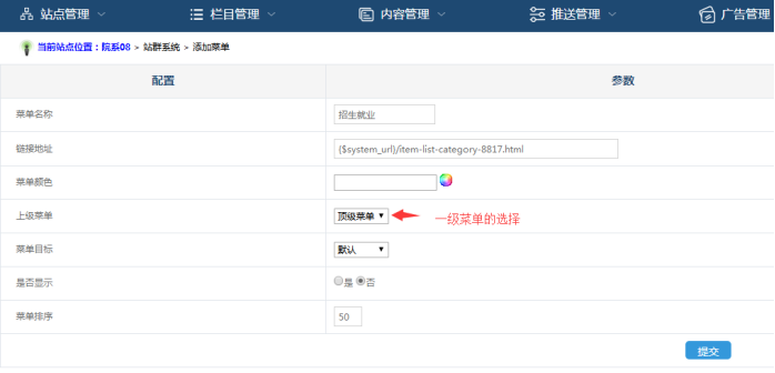 如果是一級菜單:此處就選擇“頂級菜單”即可!
