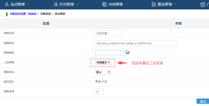 如果是二級菜單:此處就選擇“具體的某個一級菜單,比如學院概況”即可!