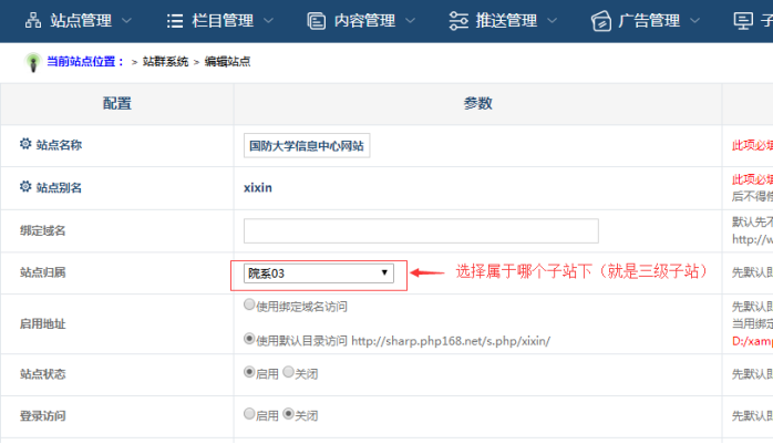 唯一不同的是,選擇站點歸屬;站群后臺----點擊此站點編輯: